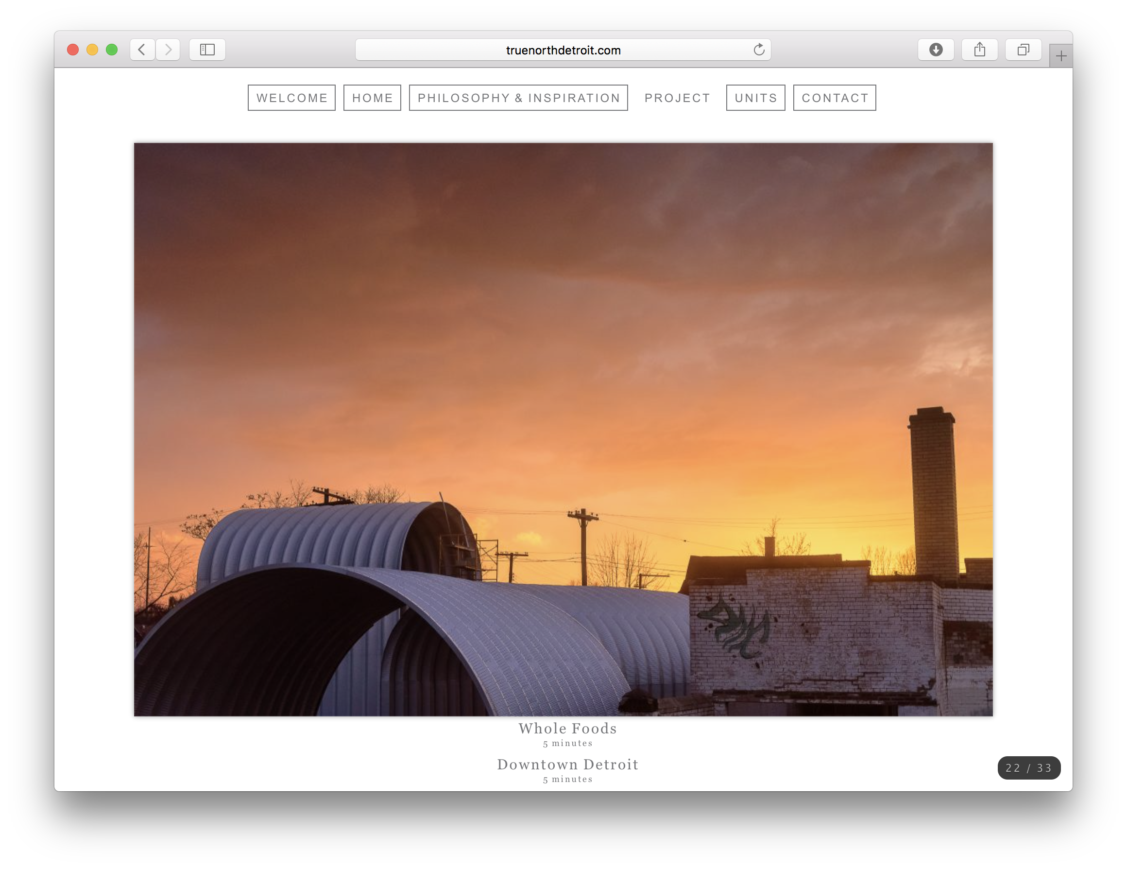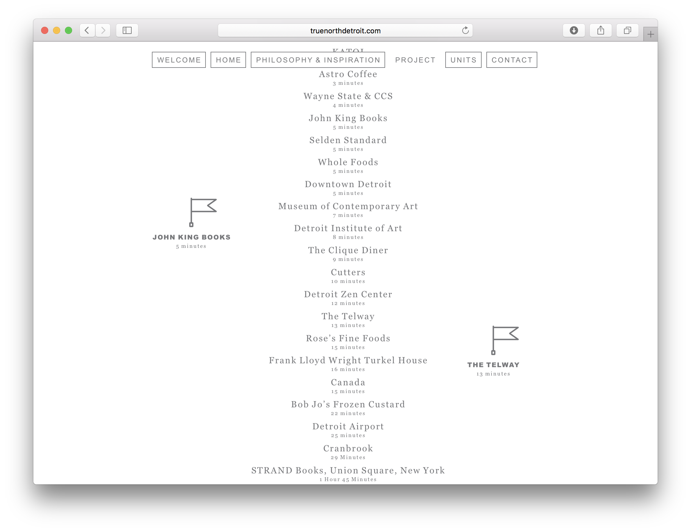 Prince Concepts had a list suggesting the mental map of those that would find True North desirable. They would be working in Detroit with the awareness of The Menil Collection in Houston (17 days and 2 hours away by foot) while thinking they needed to hit the Whole Foods down the street (3 minutes by car) to grab provisions to host friends coming in from Brooklyn that night. I was excited by this list. It identified local resources and far-flung cultural touchstones as part of the same set. This was the main idea, so I brought this to the fore to serve as the identity.